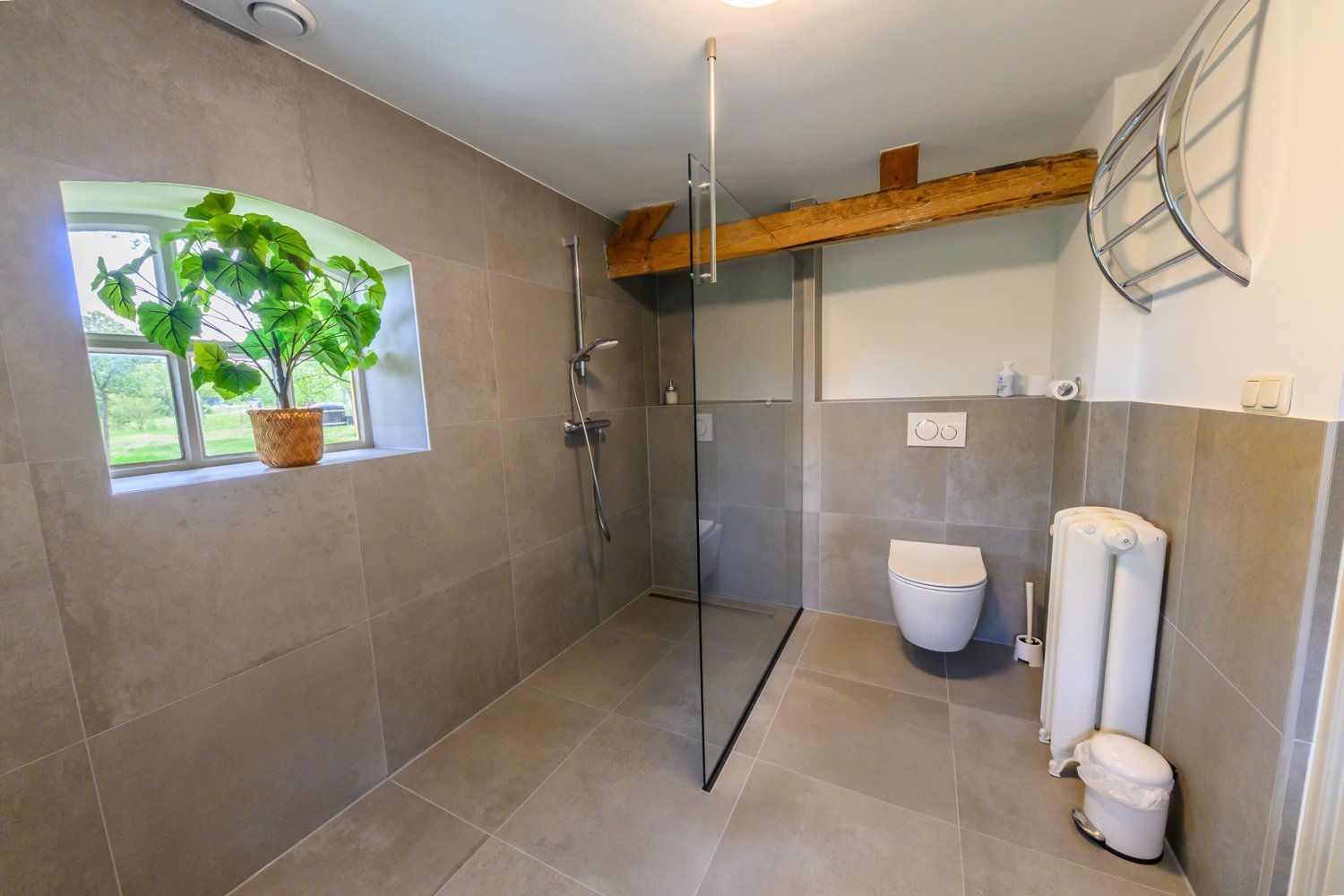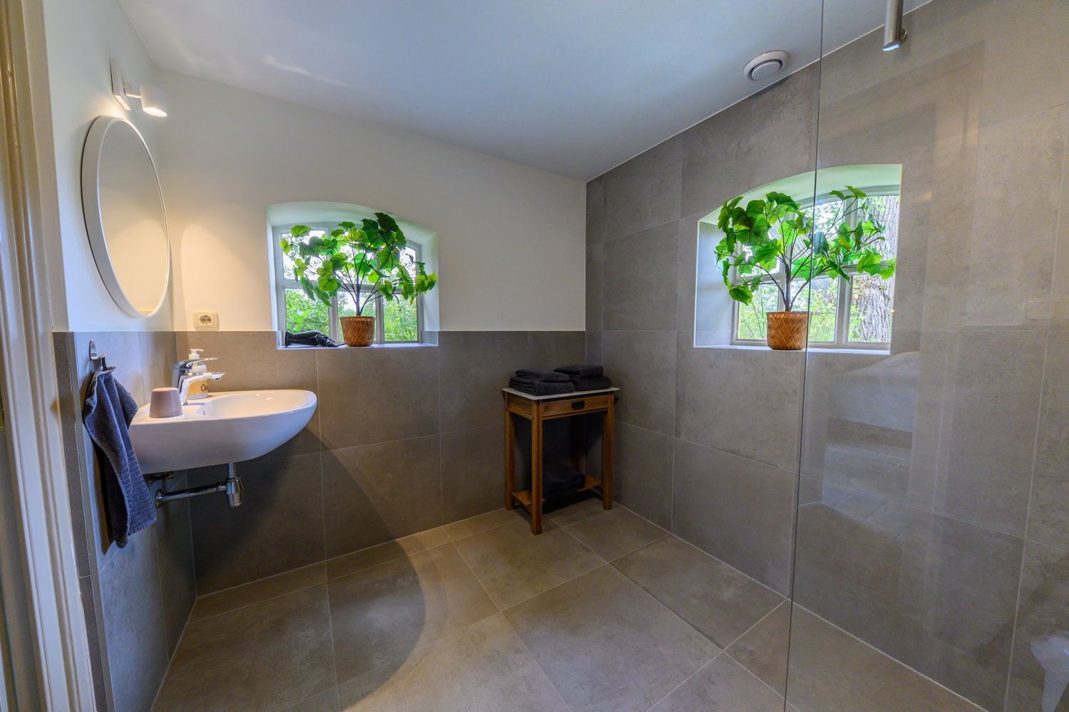 Das geräumige Badezimmer verfügt über ein Waschbecken, eine Toilette und eine große ebenerdige Dusche. Wir sorgen dafür, dass genügend Handtücher vorhanden sind und das Bett gemacht ist.